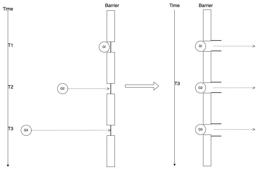 At time T3, Goroutine G3 reaches the barrier point. With all Goroutines now at the barrier, the barrier is lifted, and all three Goroutines continue their execution.
